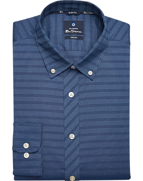 Add a punch of color and pattern to your look with this button-down collar dress shirt by Ben Sherman. A subtle, modern plaid pattern is the perfect backdrop to your favorite ties and sport coats. Slim Fit is slim and tapered across the chest, shoulders, armholes, waist and sleeves without compromising on comfort. Recommended for more triangle body types (broad shoulder and chest, narrow waist and hips).
