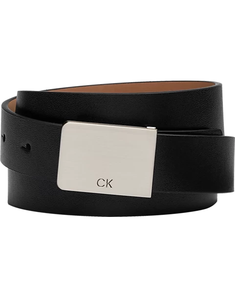This slim Calvin Klein belt features a smooth plaque buckle embossed with the CK logo for a clean, modern finish to your look.