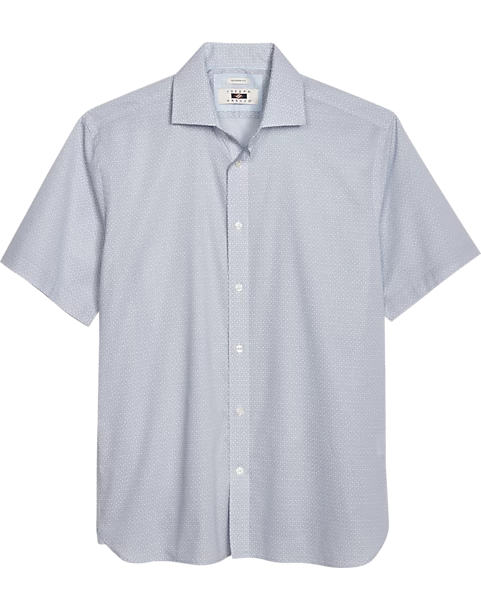 Curate a tailored but casual look with a short sleeve sport shirt by Joseph Abboud. In cool and comfortable cotton, this flattering shirt features a mini medallion pattern, spread collar, and a trim, Modern Fit.