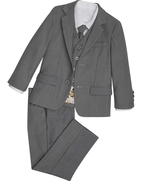 Dress your little gentleman in big guy style with this five-piece complete tuxedo set. Tailored with a Slim Fit, this stylish children’s suit is perfect for weddings, especially for ringbearers, and any other formal wear occasion. This handsome collection features a dress shirt, pre-tied tie, vest, coat, and slacks.