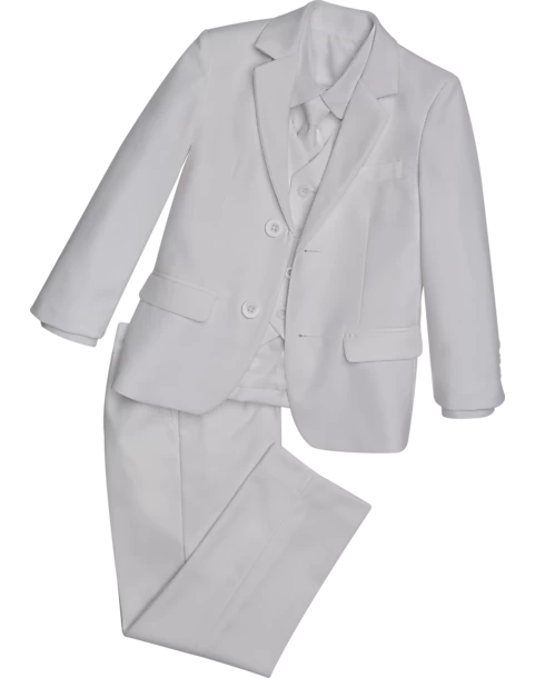 Dress your little gentleman in big guy style with this five-piece complete tuxedo set. Tailored with a Slim Fit, this stylish, all-white children’s suit is perfect for weddings, especially for ringbearers, and any other formal wear occasion. This handsome collection features a dress shirt, pre-tied tie, vest, coat, and slacks.