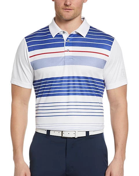 Get energized on and off the course with this sporty and stylish printed polo from PGA TOUR. Interlock knit fabric provides plenty of stretch so you can perfect your swing.