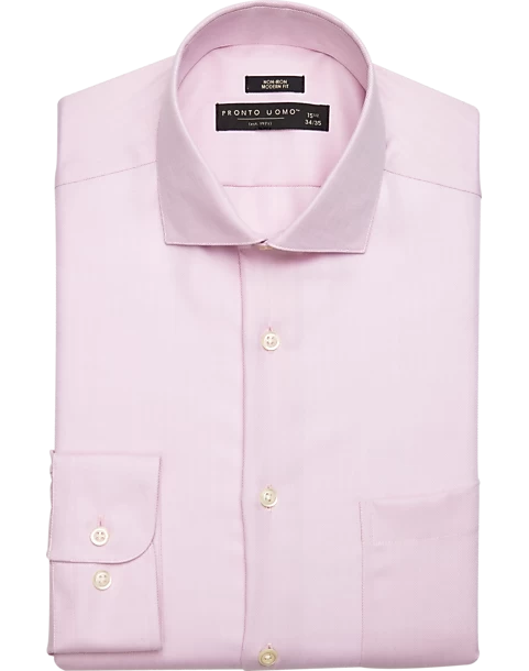 The classic herringbone pattern gets an update in this pink-colored dress shirt. Crisp tailoring includes a spread collar and a modern, trimmer fit. The no-iron cotton means there’s less for you to do to get ready. Modern Fit is close-fitting without being constricting through the chest, body, and sleeve. Recommended for more rectangular body types (shoulders aligned with hips, with the waist slightly smaller).