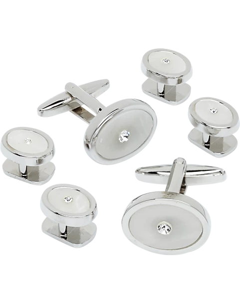 Add flair to your formalwear look with this elegant cufflink and stud set that features a white enamel base accented with a small faux diamond in the center.