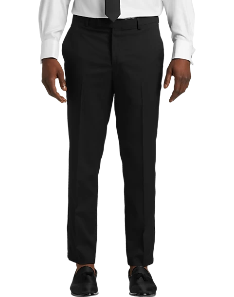 - 87% polyester 11% rayon 2% spandex|Two-button jacket|Shawl lapel|Side vents|Flat-front slacks|Finished hem
